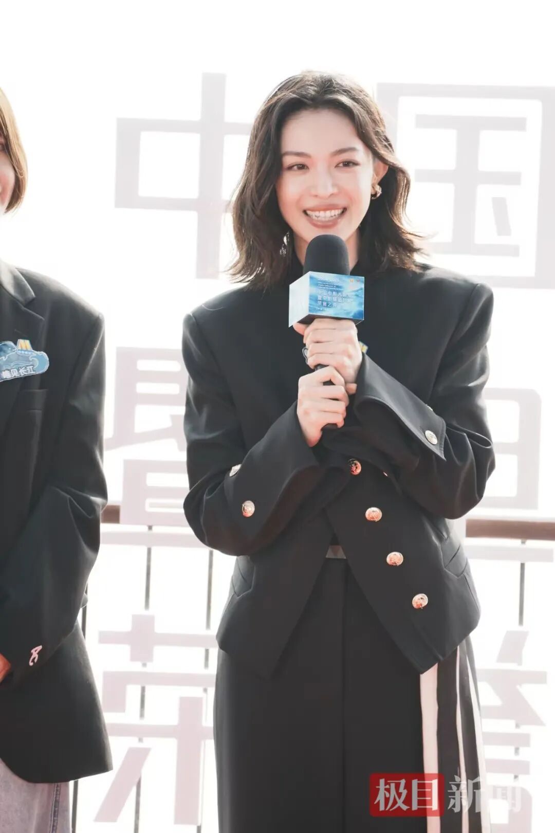 伴随着温柔的江风,电影《好东西》的编剧、导演邵艺辉与演员钟楚曦走上红毯。不同于前几天参加时尚活动时的华丽造型,此次钟楚曦以造型简约的微卷发、利落帅气的黑色套装出现在镜头前。