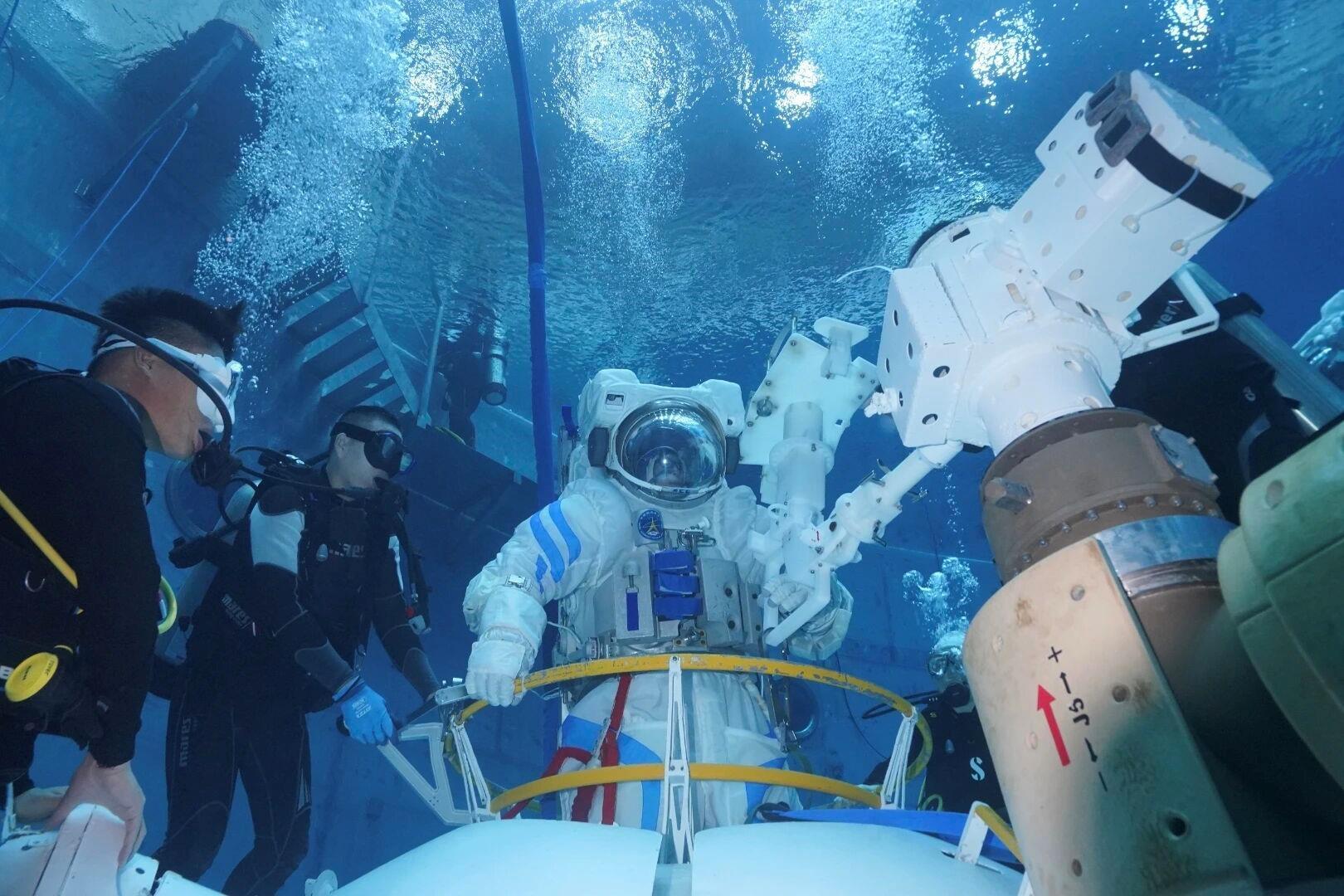△航天员张陆水下出舱活动训练前进入水下训练服