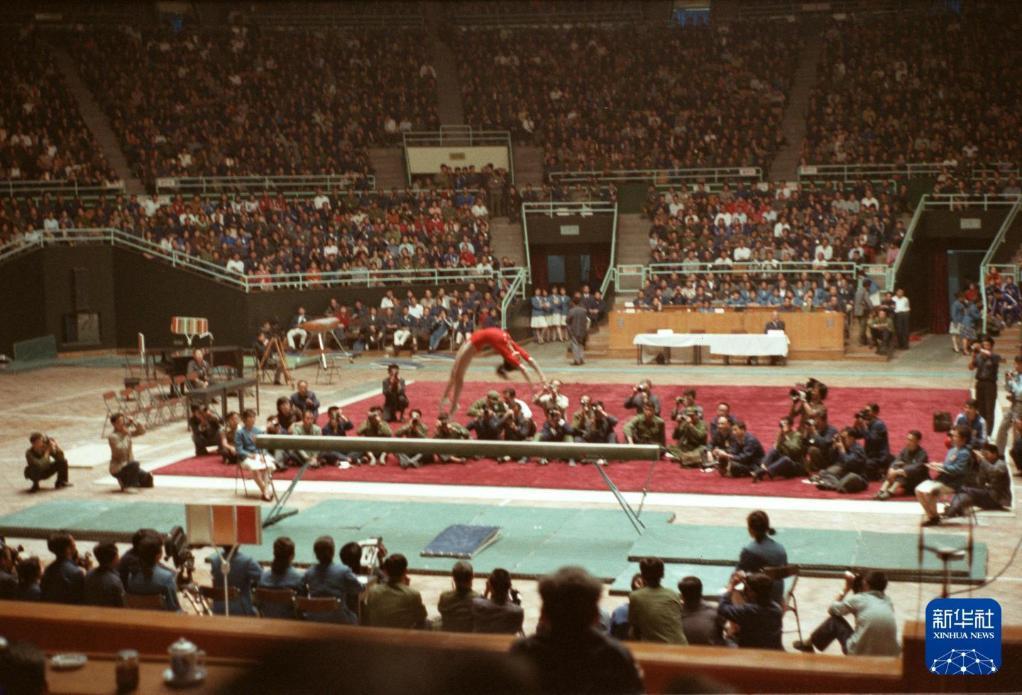 第四届全运会女子平衡木决赛场面(1979年摄)。新华社记者汤孟宗摄