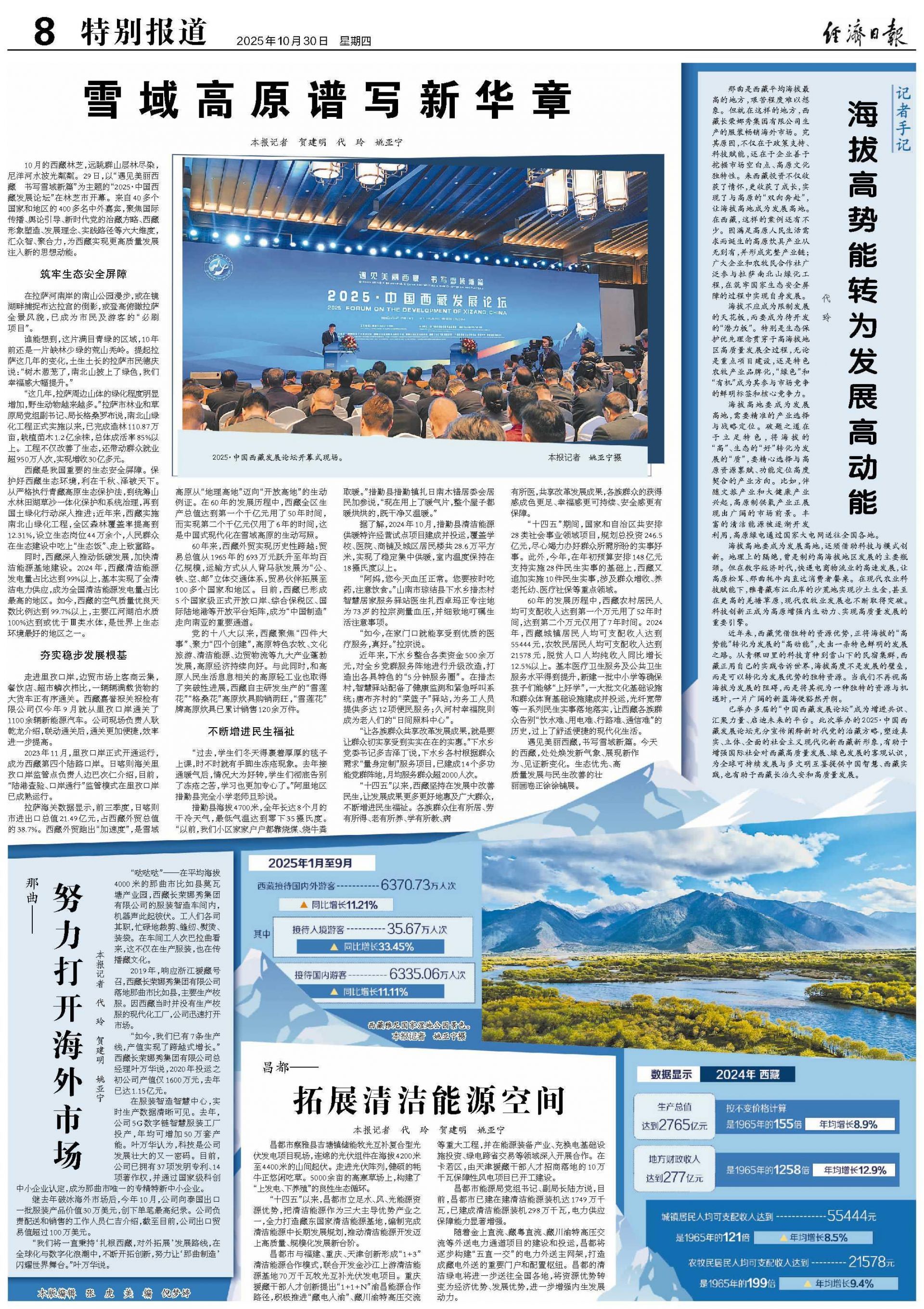 近年来,西藏凭借独特的资源优势,正将海拔的“高势能”转化为发展的“高动能”,走出一条特色鲜明的发展之路。从青稞田里的科技育种到雪山下的民宿集群,西藏正用自己的实践告诉世界,海拔高度不是发展的壁垒,而是可以转化为发展优势的独特资源。当我们不再视高海拔为发展的阻碍,而是将其视为一种独特的资源与机遇时,一片广阔的新蓝海便豁然开朗。