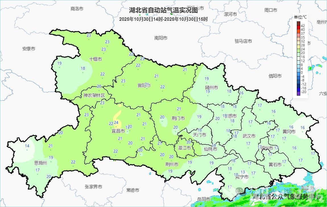 湖北日报讯(记者曾莉)10月30日早晨,十堰、襄阳、恩施、宜昌、荆门、黄冈、黄石、咸宁等55个乡镇出现局地浓雾,老河口最低能见度不足50米。上午,南部局地和东部地区有弱降水出现,午后雨水渐停转为阴天,15时东部地区气温下滑2至6℃,普遍在15至19℃,西部地区则在20至23℃。好在此轮降水来去匆匆,预计未来三天,鄂西南地区有小雨,其他地区以多云为主。