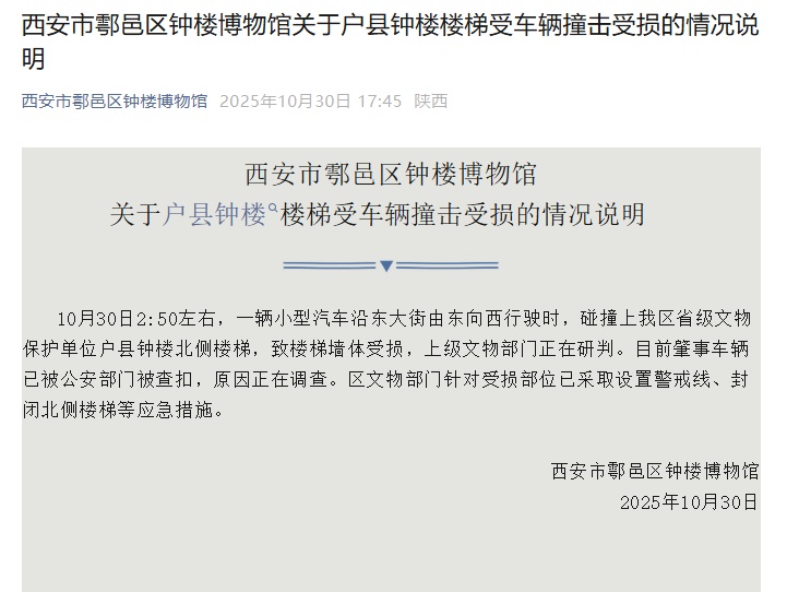 10月30日,西安市鄠邑区钟楼博物馆发布情况说明: