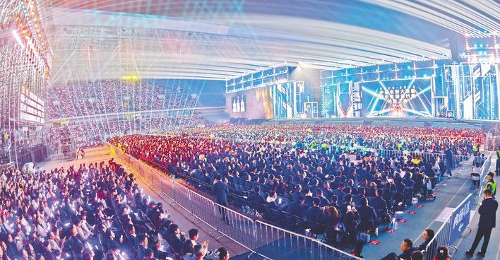 19时,奥体中心灯光骤熄,无数光束如利剑般刺破夜空,在夜幕中切割出流动的光影轨迹,瞬间将会场打造成未来感十足的科技殿堂。