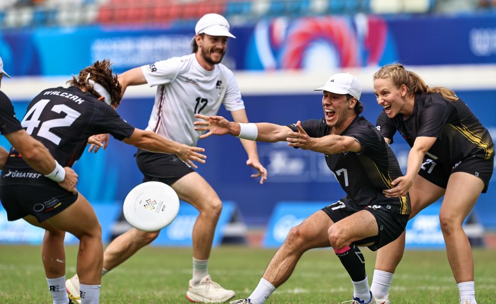 8月16日,德国队在比赛中庆祝得分。当日,在2025年成都世运会团队飞盘铜牌赛中,法国队战胜德国队,夺得铜牌。新华社记者 孙凡越 摄