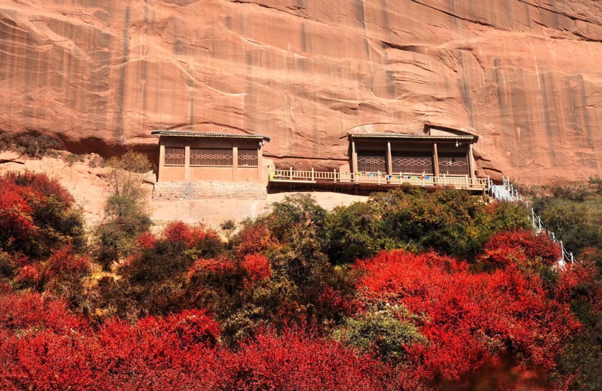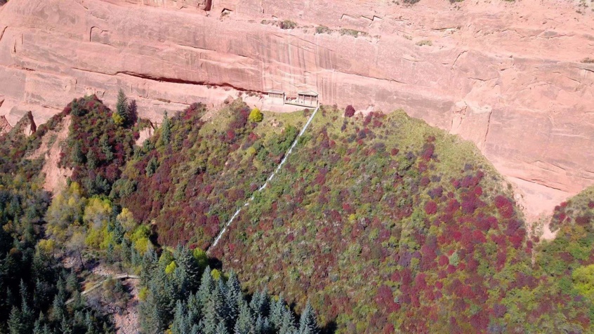 开凿于红砂崖壁上的金塔寺石窟,要上去得爬240级台阶