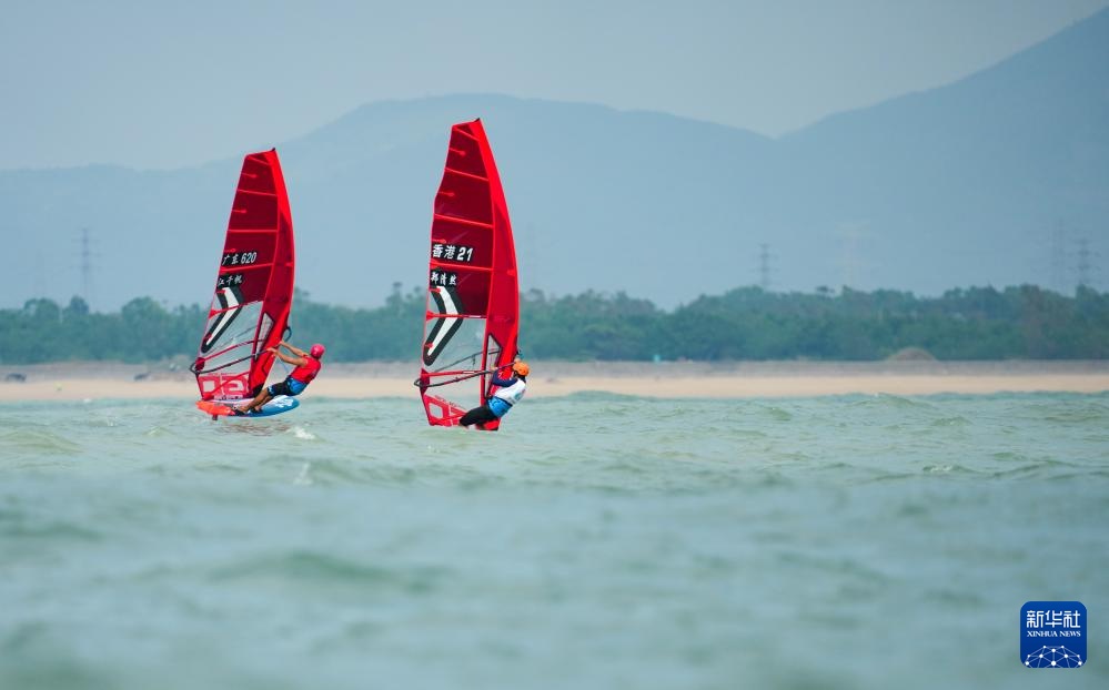 10月30日,广东队选手江千帆(左)和香港队选手郑清然(中)在男子水翼帆板级奖牌赛比赛中。最终,江千帆获得季军,郑清然获得第四名。