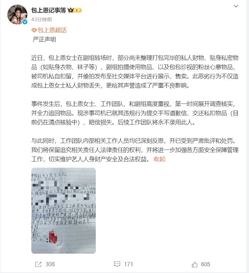10月31日,@包上恩记事簿 发严正声明,透露近日包上恩在剧组转场时,部分尚未整理打包完毕的私人财物、贴身私密物品(如贴身衣物、袜子等)、剧组拍摄使用物品、以及珍视的粉丝心意物品,“被司机私自扣留,并偷拍发布至社交媒体平台进行展示、售卖。”