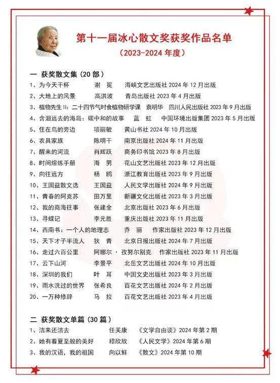 10月30日,第十一届冰心散文奖在贵州仁怀揭晓,51部(篇)作品获奖。