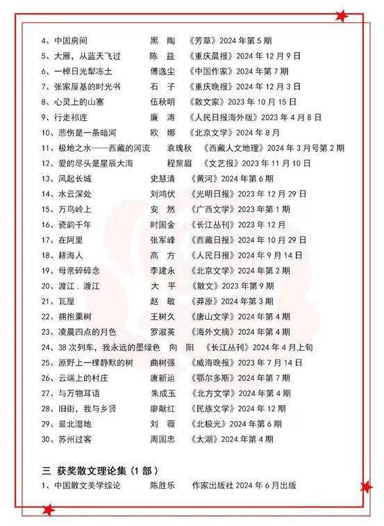 谢冕《为今天干杯》、肖辉跃《醒来的河流》等20部佳作摘得散文集奖;任芙康《洁来还洁去》、欧娜《悲伤是一条暗河》等30篇作品获评散文单篇奖。