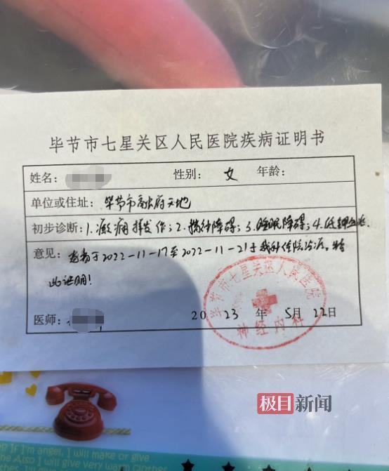 毕节市七星关区医院疾病证明书显示,莎莎于2022年11月17日至21日在该院治疗,初步诊断癫痫发作、精神障碍、睡眠障碍。莎莎说,后来经过精神病院诊断,她患上了重度焦虑症和重度抑郁症,严重失眠。而莎莎前夫和女孩家属,已就此事达成和解。