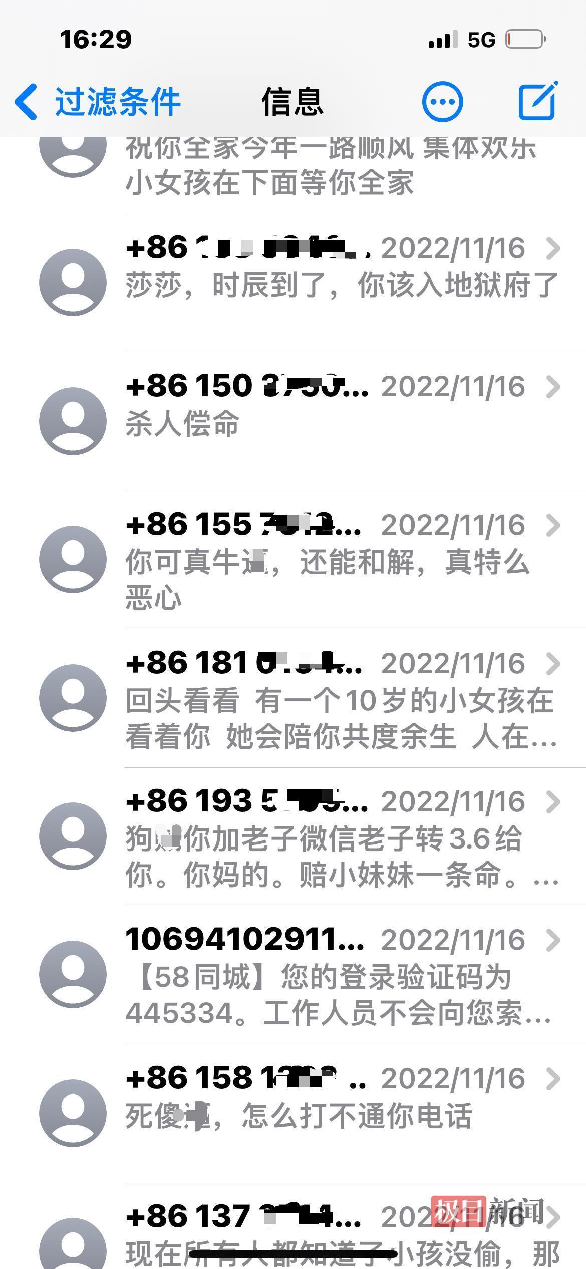 网暴者通过短信辱骂莎莎
