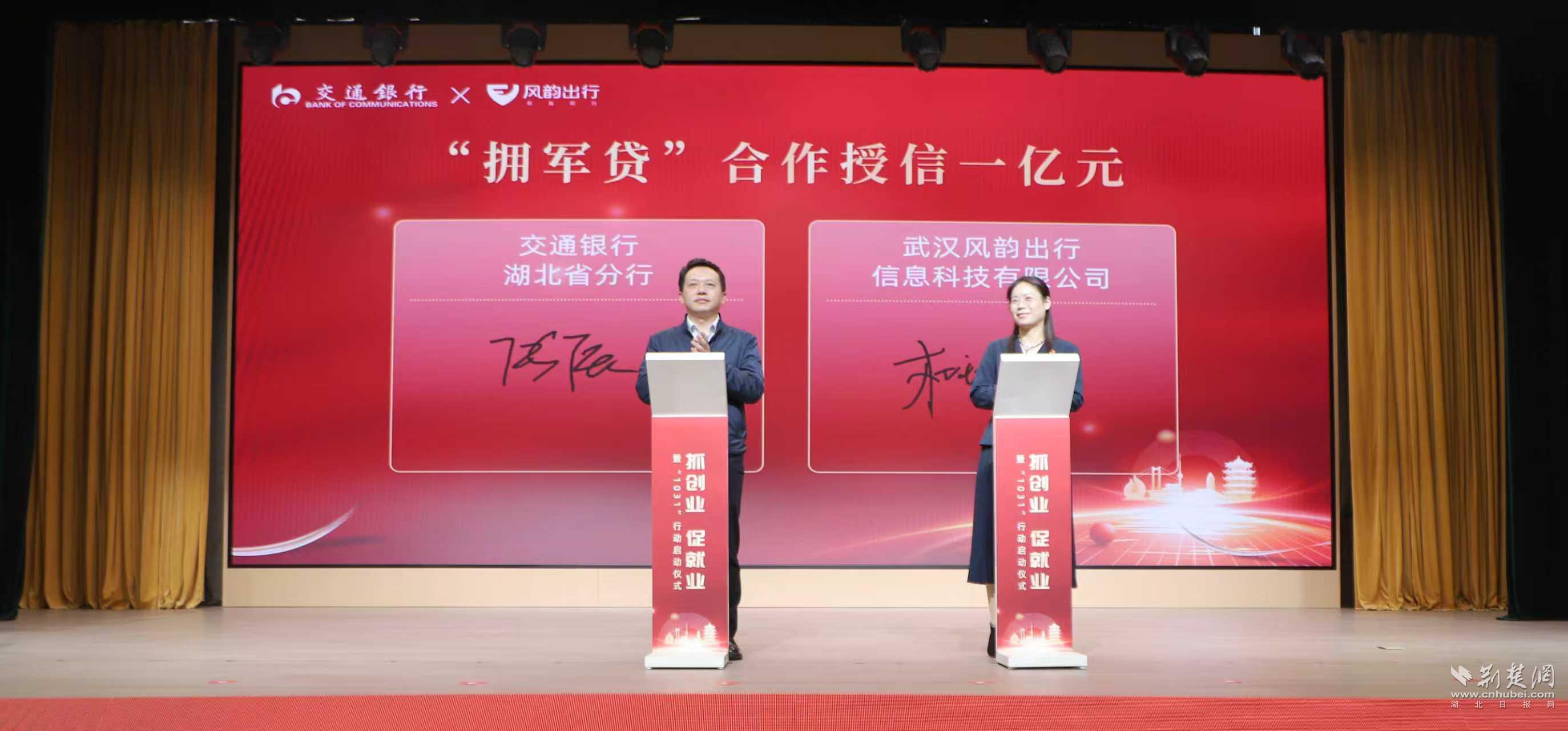 风韵出行与交通银行洪山支行签订合作授信协议;湖北戎创农企创业就业联盟、戎创汽车产业联盟、戎创人工智能应用联盟、戎创低空经济联盟的代表分别与有创业意愿的退役军人代表现场现场签订创业创新合作协议;湖北戎创汽车产业联盟与10名退役军人车队长签订合作协议。