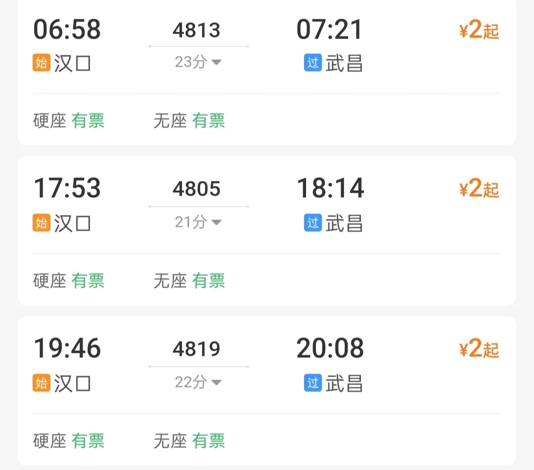 根据铁路12306票务信息,此次新开的普速列车涵盖汉口与武汉东之间往返线路:汉口至武汉东方向有4813、4805、4819三趟列车,武汉东至汉口方向有4802、4806、4818三趟列车,全程票价4元,运行时间在1小时左右,精准覆盖早晚出行高峰期。