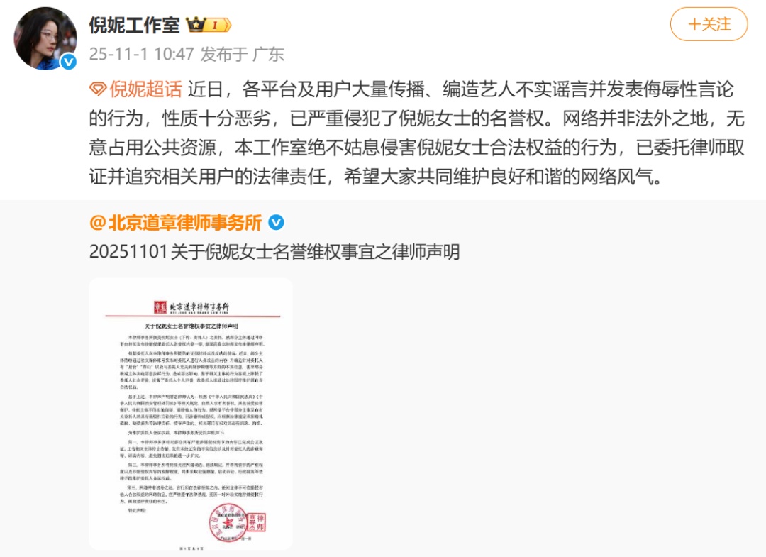 11月1日,倪妮委托律师事务所发布声明,针对有“后台”“靠山”以及与委托人无关的所涉剧组等方面的不实信息,启动法律程序,强调将追究侮辱诽谤者的责任。声明全文如下: