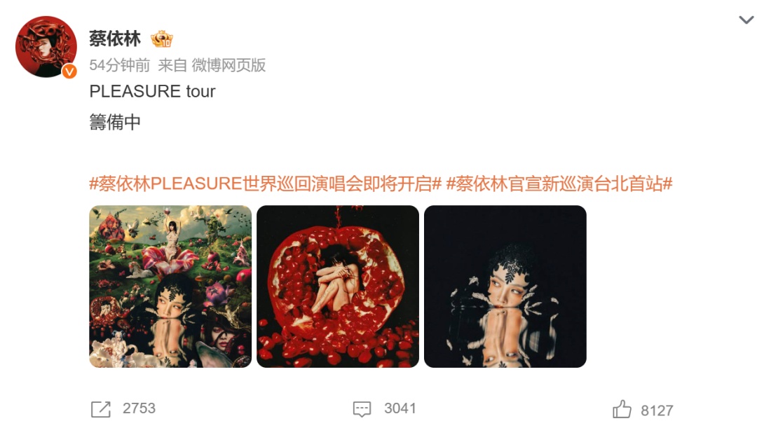 歌手蔡依林今天发文宣布,最新巡演Pleasure Tour首站定于2025年12月30日、31日及2026年1月1日,共3场,更为瞩目的是,首站是在可容纳四万人的中国台北大巨蛋举行,这也是蔡依林首次挑战超大型场馆。
