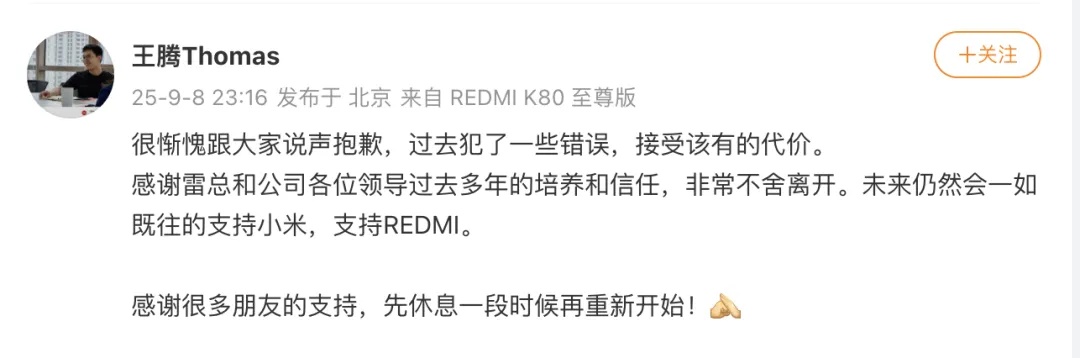 王腾当天23时16分发布微博回应称,“很惭愧跟大家说声抱歉,过去犯了一些错误,接受该有的代价。感谢雷总和公司各位领导过去多年的培养和信任,非常不舍离开。未来仍然会一如既往的支持小米,支持REDMI。”