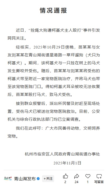 经核实,2025年10月29日傍晚,苗某某与女友刘某某在青山湖街道星港路一草坪遛狗(犬只为柯基犬)。期间,该柯基犬与一只拴在树上的马犬发生撕咬并受伤。随后,苗某某与刘某某将受伤的柯基犬带至附近一家宠物医院治疗,并将马犬也带至该宠物医院门口。得知柯基犬耳朵被咬无法恢复后,苗某某殴打马犬,致马犬受伤。