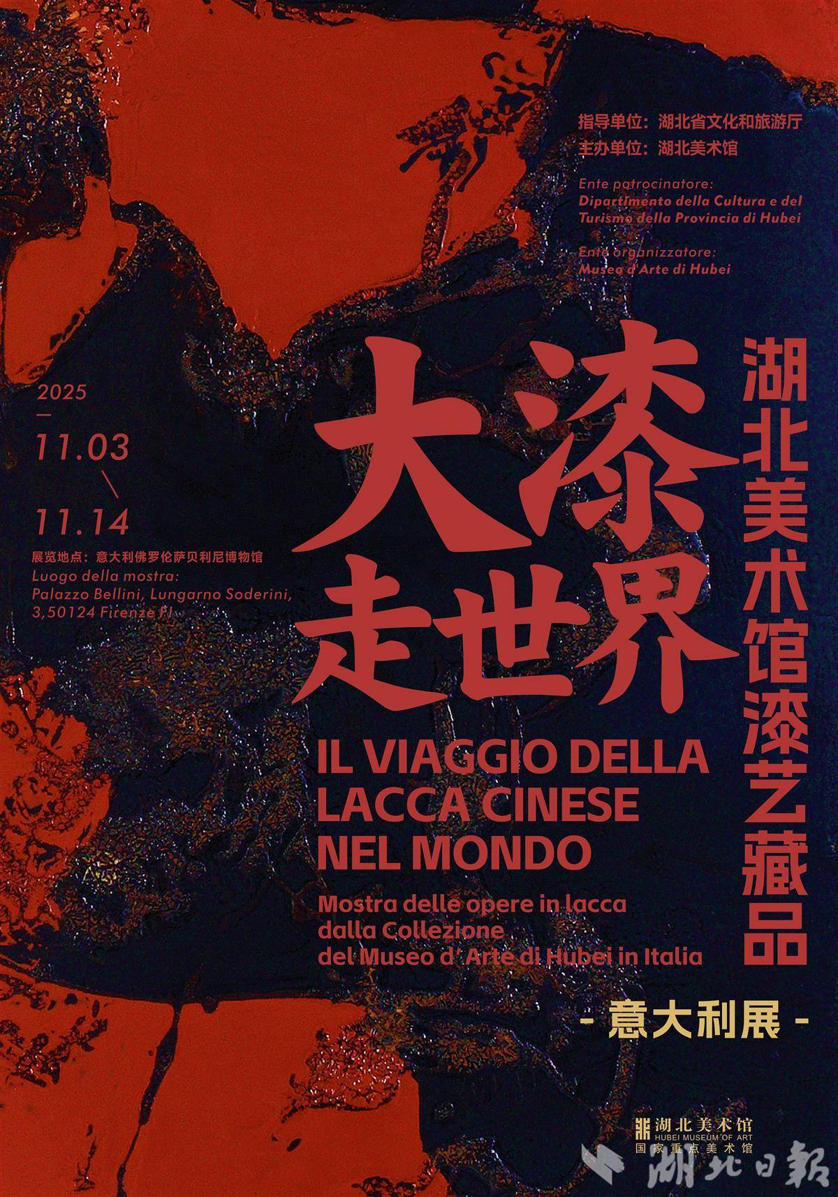 据悉,为推进大漆艺术的创造性转化、创新性发展,湖北美术馆打造了具有国际影响力的品牌展览“湖北漆艺三年展”,从2010年创办至今,已成功举办五届,并形成大漆艺术的特色收藏。同时,以湖北美术馆馆藏漆艺作品为基础,推出“大漆走世界”文化交流项目,曾赴埃及、韩国、德国、卢森堡等地交流展出,获得了良好的国际影响和社会效应。湖北美术馆曾先后推出多个意大利艺术专题展览,包括“光的现代性——1850—1950意大利托斯卡纳油画展”“突如其来——意大利当代艺术展”以及“意大利当代艺术家约利佐·米开里罗油画展”等。这些展览不仅呈现了意大利从历史到当代的多元艺术风貌,更搭建起一座跨越时空的对话之桥,让湖北的观众得以近距离欣赏意大利艺术家的精彩创作。