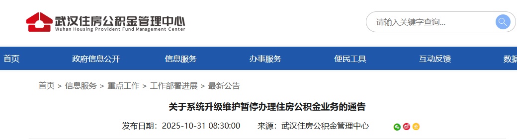 10月31日,武汉住房公积金管理中心发布关于系统升级维护暂停办理住房公积金业务的通告。全文如下: