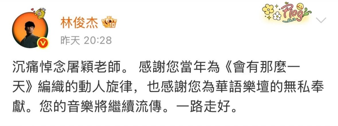 1日晚,歌手林俊杰在社交平台发文,悼念屠颖,并感谢屠颖当年为自己的《会有那么一天》编织动人旋律,“也感谢您为华语乐坛的无私奉献。您的音乐将永久流传。一路走好。”