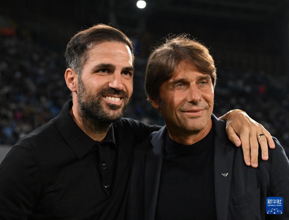 11月1日,那不勒斯队主教练孔蒂(右)与科莫队主教练法布雷加斯在赛前合影。