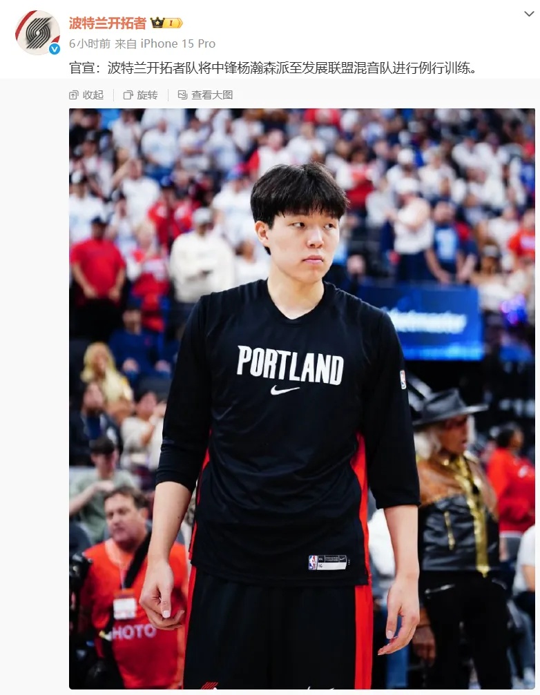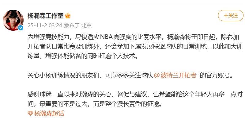 杨瀚森工作室发布声明:为增强竞技能力,尽快适应NBA高强度的比赛水平,杨瀚森将于即日起,除参加开拓者队日常比赛及训练外,还会参加下属发展联盟球队的日常训练,以此加大训练量,增强体能储备的同时打磨个人技术。