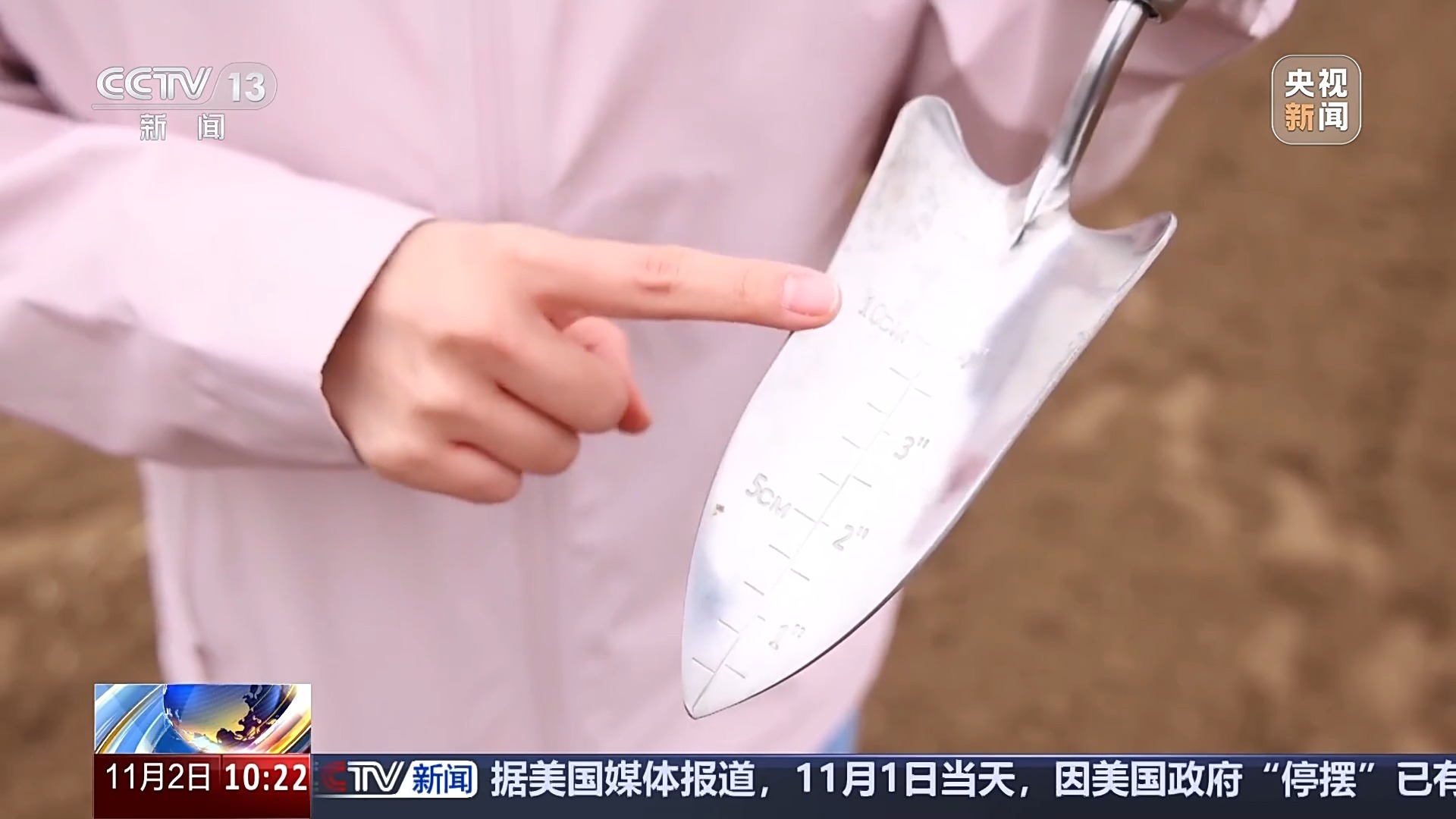 这里是河北邢台的一处麦田,2.2万亩的冬小麦正在加紧播种,播种过后,农民会用带尺子的小铲子测量播种深度。今年因为土壤偏湿,气温偏低,播种深度比正常年份要浅上1到2厘米。这样种子可以早萌发,快出苗。一旦发现种子播得深了,就要及时调整播种机。