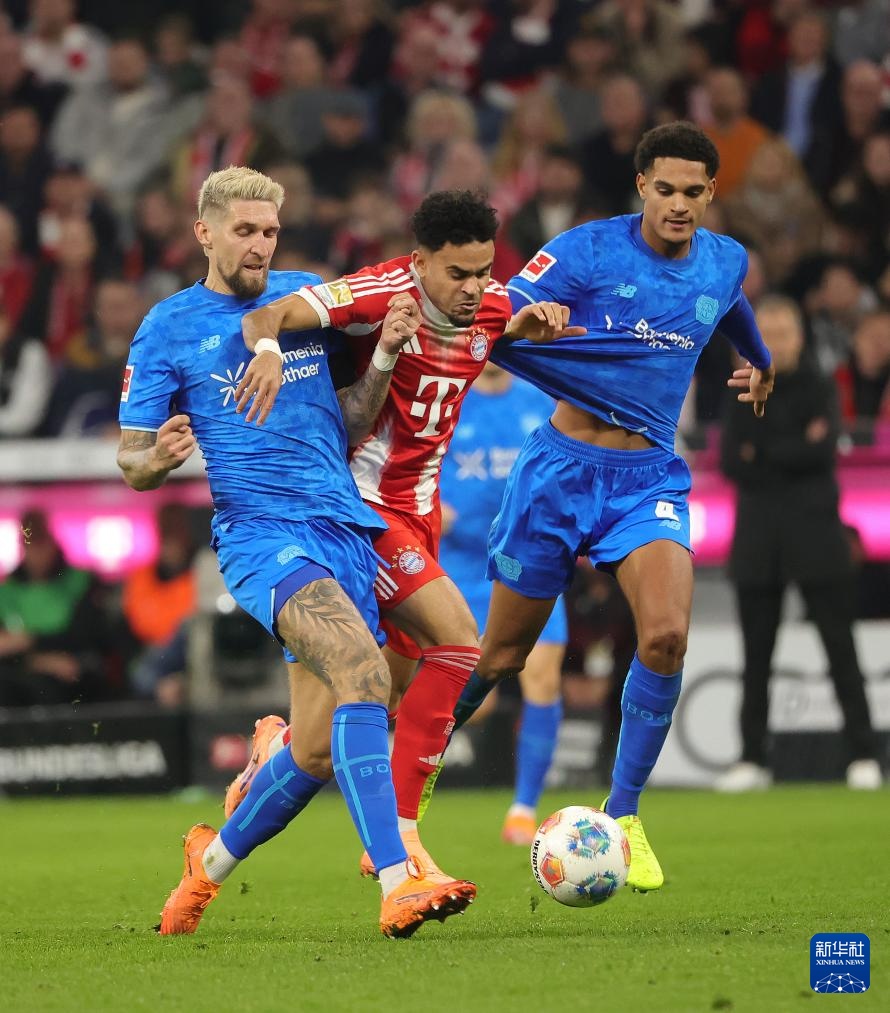 11月1日,拜仁慕尼黑队球员迪亚茨(中)和勒沃库森队球员匡萨(右)、安德里希在比赛中拼抢。