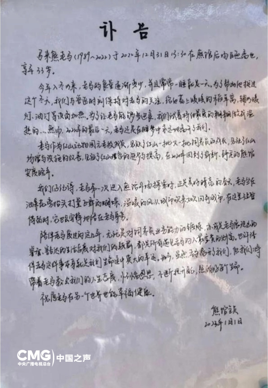 老马1989年来到动物园。后来,园区着手改造熊谷,将整座山头纳入其中。改造完成后,30多岁、相当于人类95岁高龄的老马重返家园。沈志军说,让这只一生都生活在动物园里的熊感受野外环境,正是场馆改造的价值所在,“初到户外运动场的时候,它迈着悠闲的步伐,累了会半倚在石头边休息喘气,看看花、看看蝴蝶。”老马没有看到2023年的第一缕阳光,饲养员为它写了一份讣告,引发无数网友的共情。