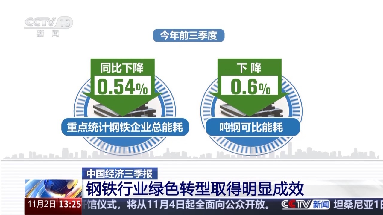 记者从中国钢铁工业协会了解到,今年前三季度,全国钢铁企业总能耗同比下降0.54%,生产每吨合格钢所消耗的能源总量下降0.6%,行业绿色转型成效显著。