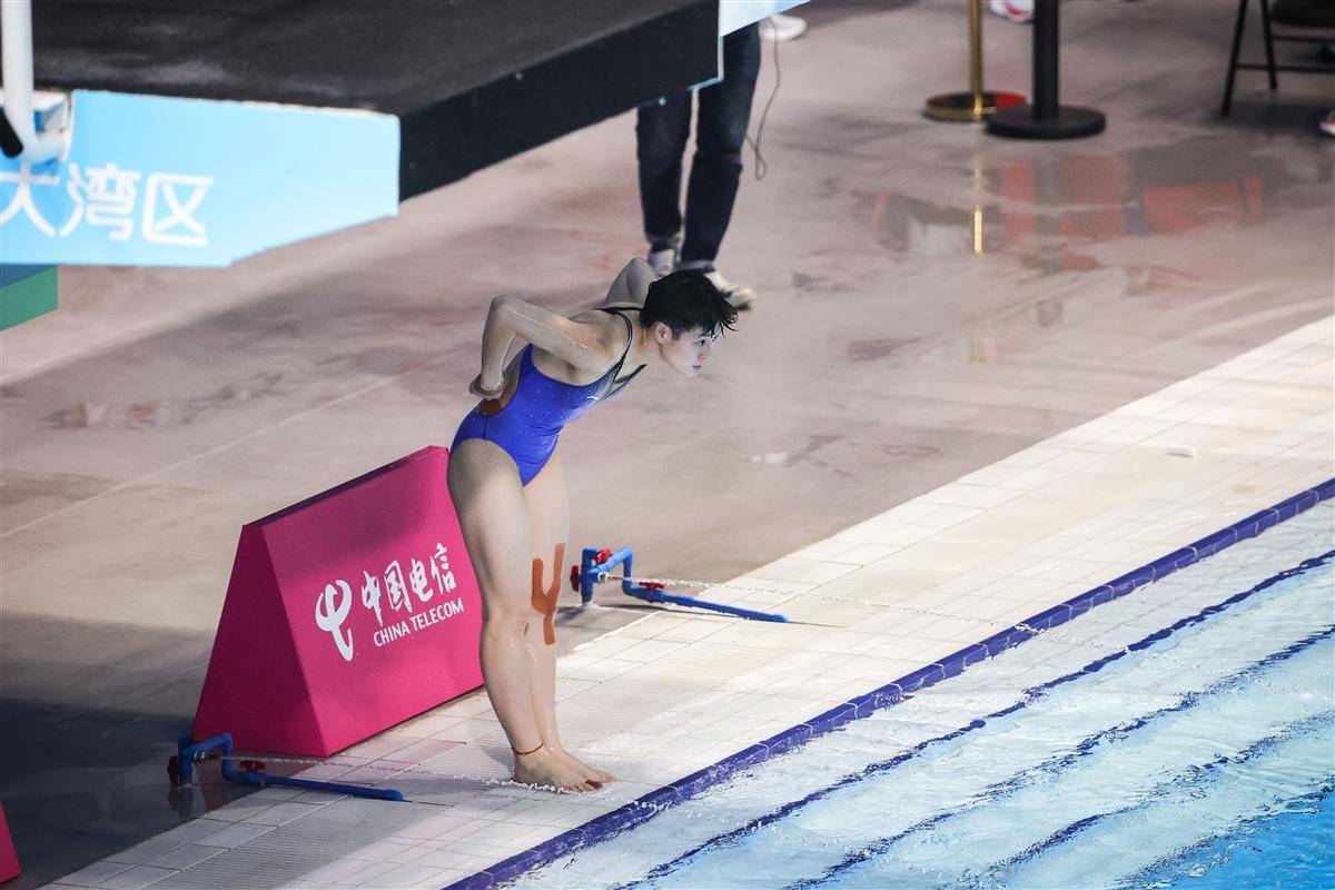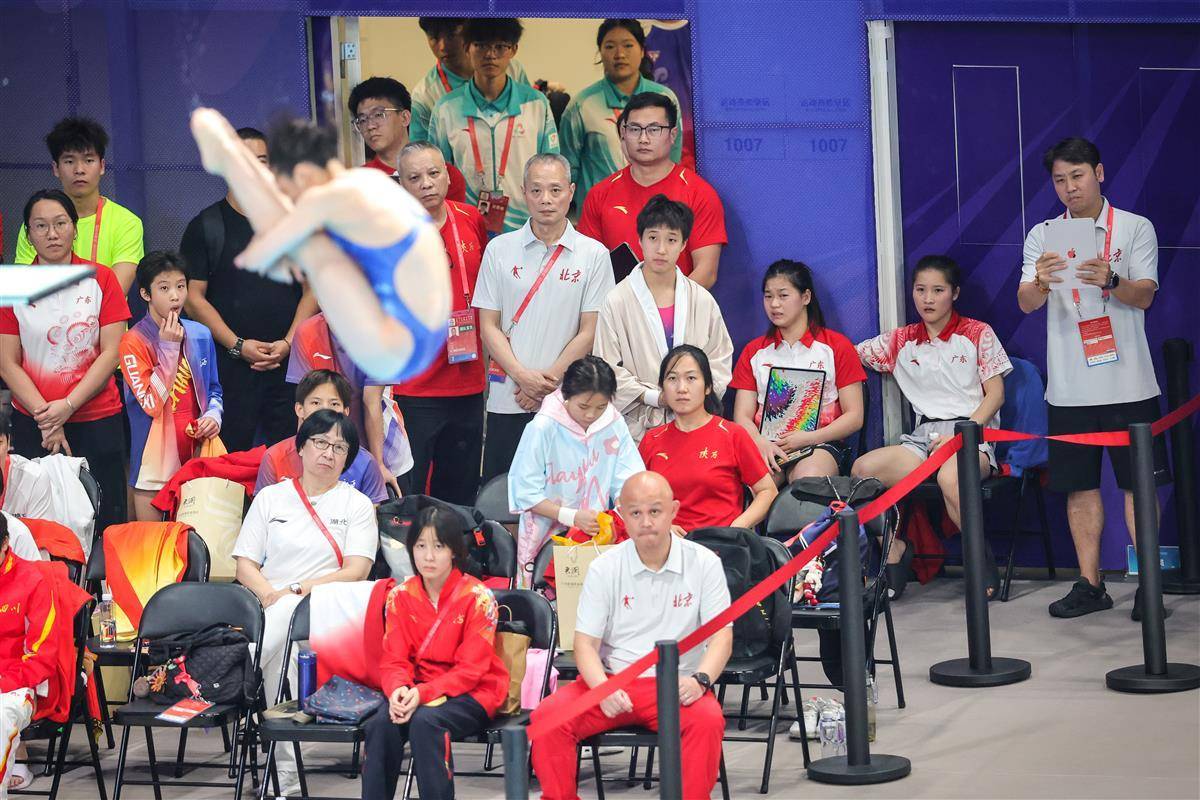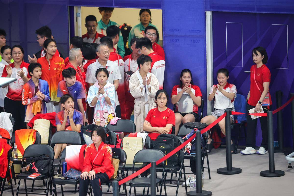11月2日,广东奥体中心游泳馆,奥运冠军、广东名将全红婵在候场第十五届全运会跳水女团双人十米台比赛时,观看女团个人三米板“神仙打架”,为师姐陈艺文欢呼,其他选手失误时又表情丰富。(湖北日报全媒记者 时龚 摄)