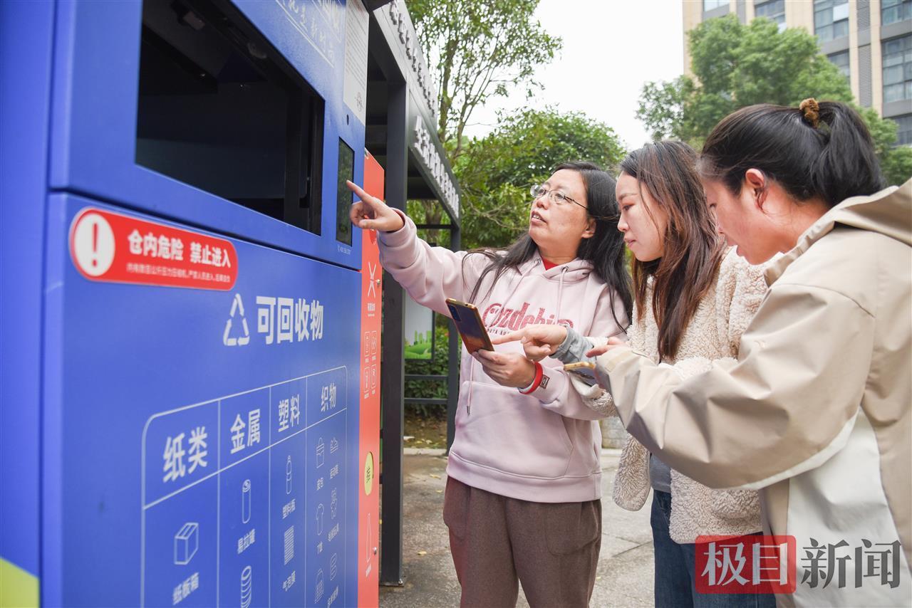 10月31日,荆州市沙市区解放街道十方庵社区工作人员在指导房投·十方庵小区的居民使用智能可回收物箱(极目新闻记者 黄志刚 摄)