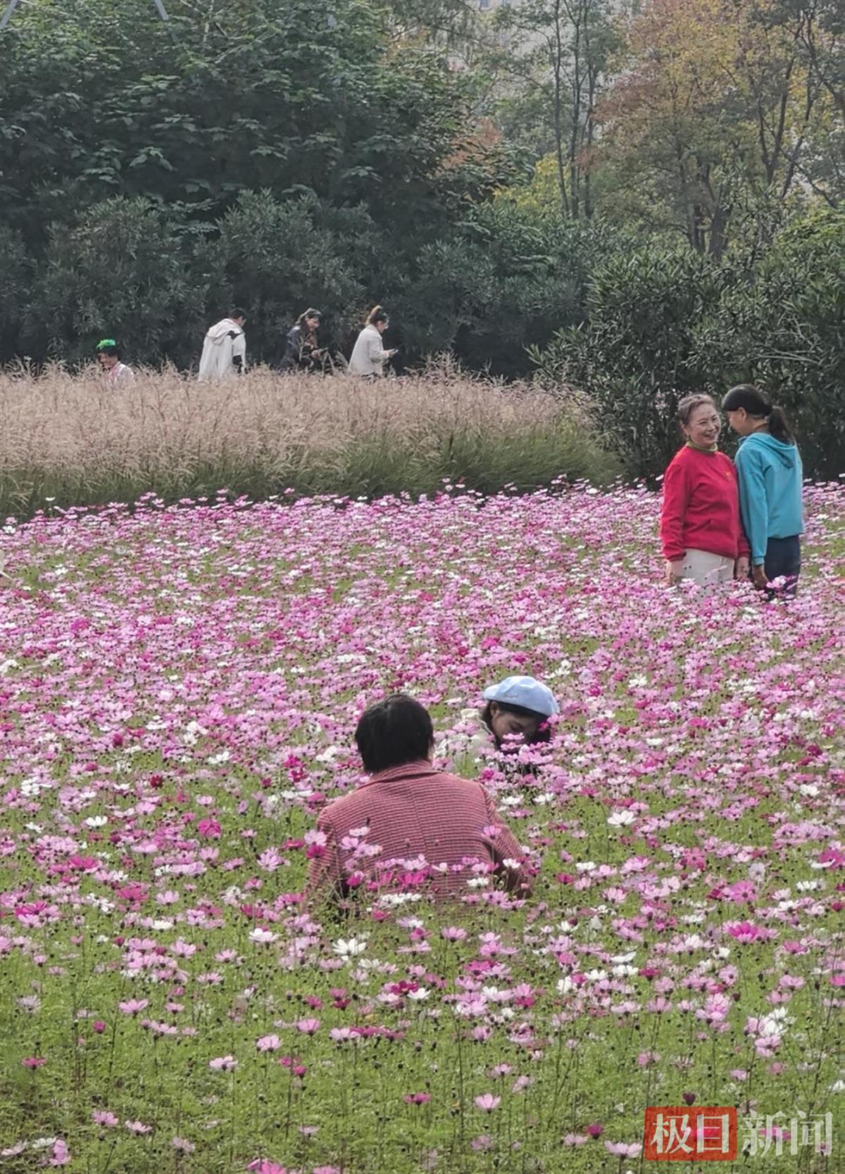 粉的、白的、紫的花错落着,有小朋友在花丛中嬉戏,有年轻的朋友戴着洋帽在花丛中拍照,也有阿姨们在花丛中跳舞,花海和人群交相辉映,美不胜收。