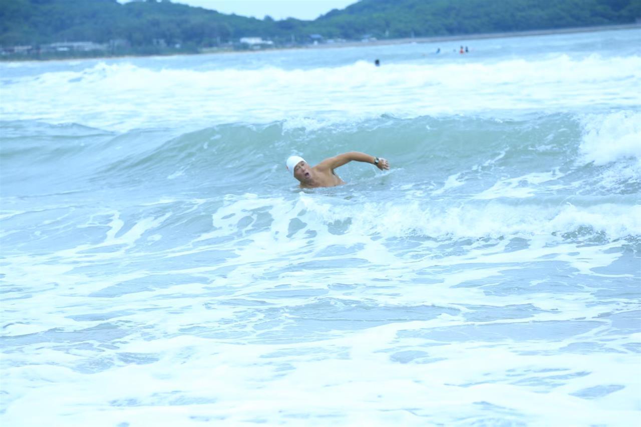 11月2日,海上虽然风浪很大,但鲍政斌还是决定下海。“我先是在沿岸小游个来回,试试水性。谁知一排巨浪劈头盖脸打来,把我往深处拖带,卷起的沙子打了我一脸。”鲍政斌说,后来他不停变换泳姿,终于绕过礁石,游出港湾。