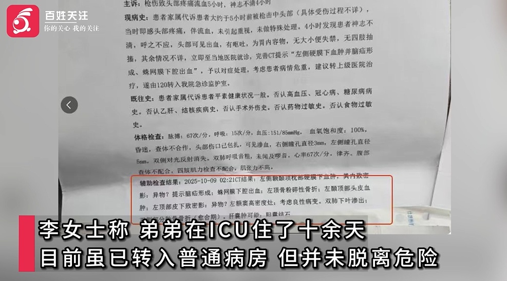 男子的姐姐李女士称,“他那个子弹是铅的,是那种铅弹,那个枪打进去的时候,头骨一档,就把那个子弹给打的碎掉了。现在那个头骨里面还有一部分没取出来,人是抓到了,现在在拘留所,对方也不拿钱来,他要我们拿那个谅解书他才肯出钱。”