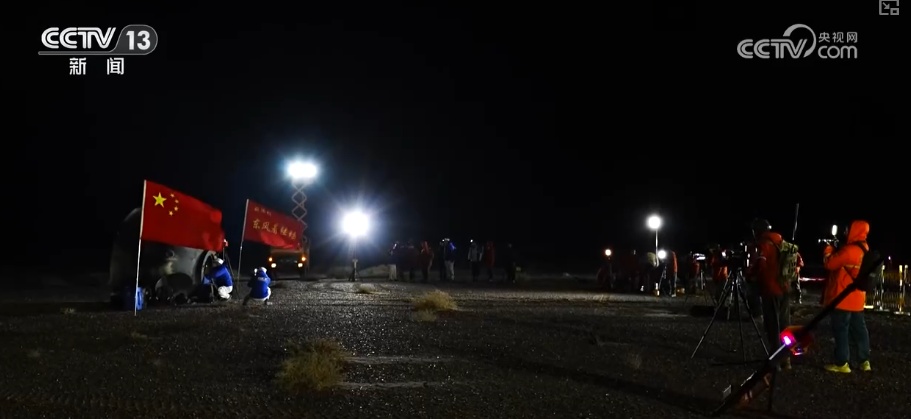 北京中心通报返回舱落点坐标后,搜救回收空中分队5架直升机迅速起飞升空,奔赴落点空域,精准降落在返回舱周围后,立即按程序进行相关处置。