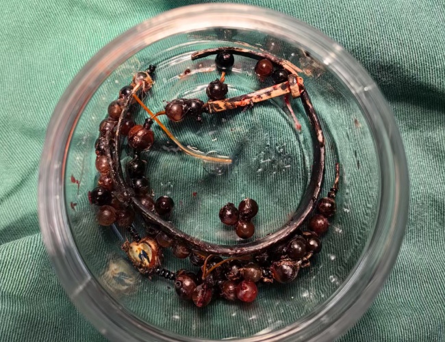 “这是典型的首饰长期压迫、摩擦,加上细菌感染,引发的慢性炎症和肉芽组织增生。”医生介绍,此时,手镯和串珠已经成了一个不断刺激皮肤、污染伤口的“病灶”,如果不尽快手术取出,感染可能进一步扩散,甚至危及生命或影响手臂功能。