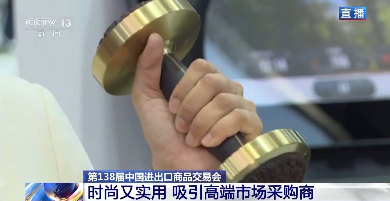 还有这个由黄铜和实木打造的哑铃,精致的外观设计不仅能够健身使用,还可以放在家里当艺术摆件,吸引了许多高端市场采购商的关注。
