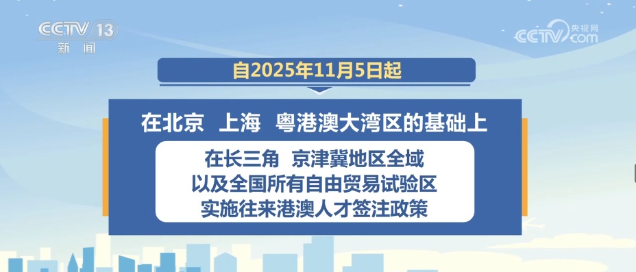 10项政策有:扩大往来港澳人才签注政策试点实施范围。自2025年11月5日起,在北京、上海、粤港澳大湾区的基础上,在长三角、京津冀地区全域,以及全国所有自由贸易试验区实施往来港澳人才签注政策。在上述区域工作的内地杰出人才、科研人才、文教人才、卫健人才、法律人才以及其他人才,可凭人才主管部门、符合条件的用人单位等出具的有关人才证明,申请办理有效期1至5年不等的多次往来香港或者澳门人才签注,每次在香港或者澳门停留不超过30天。