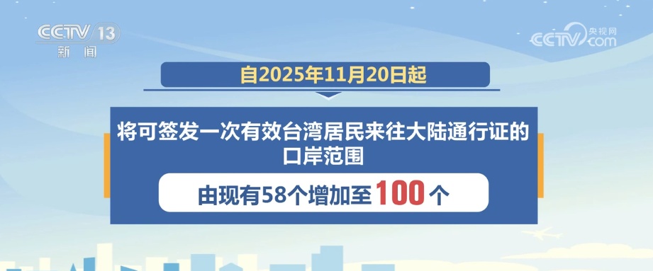新政还包括,自2025年11月20日起,将可签发一次有效台湾居民来往大陆通行证的口岸范围由现有58个增加至100个。42个新增口岸有天津港、满洲里(机场)、云南磨憨铁路公路等口岸。