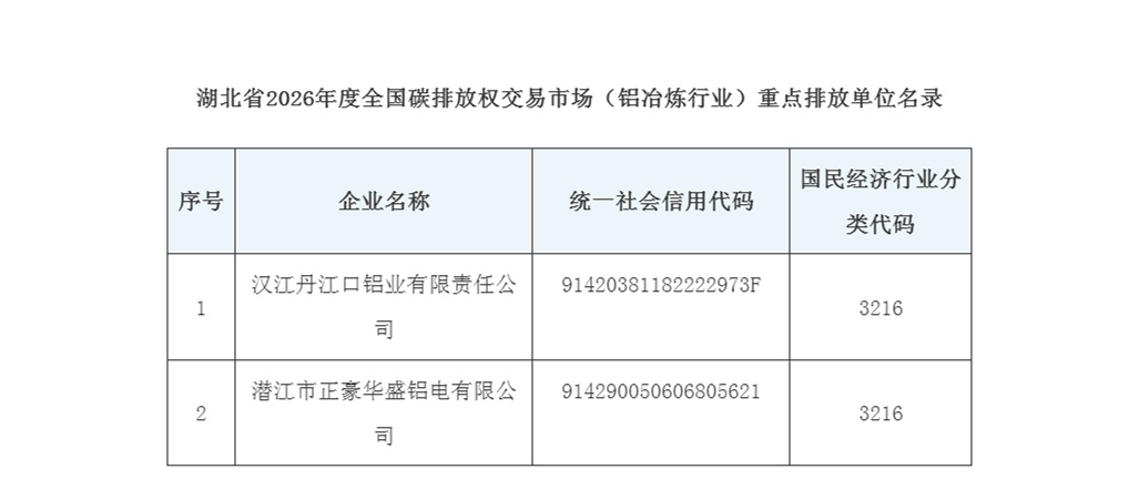 湖北省2026年度全国碳排放权交易市场(铝冶炼行业)重点排放单位名录