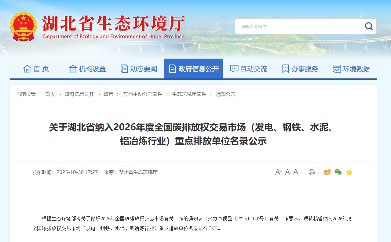 湖北日报讯(记者刘郸、通讯员李斌)近日,省生态环境厅公示了湖北省纳入2026年度全国碳排放权交易市场(发电、钢铁、水泥、铝冶炼行业)重点排放单位名录,湖北共有104家企业参与全国碳市场交易。