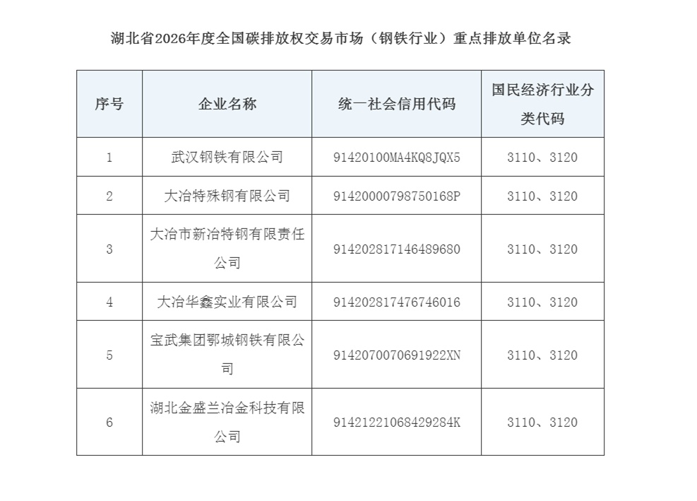 湖北省2026年度全国碳排放权交易市场(钢铁行业)重点排放单位名录