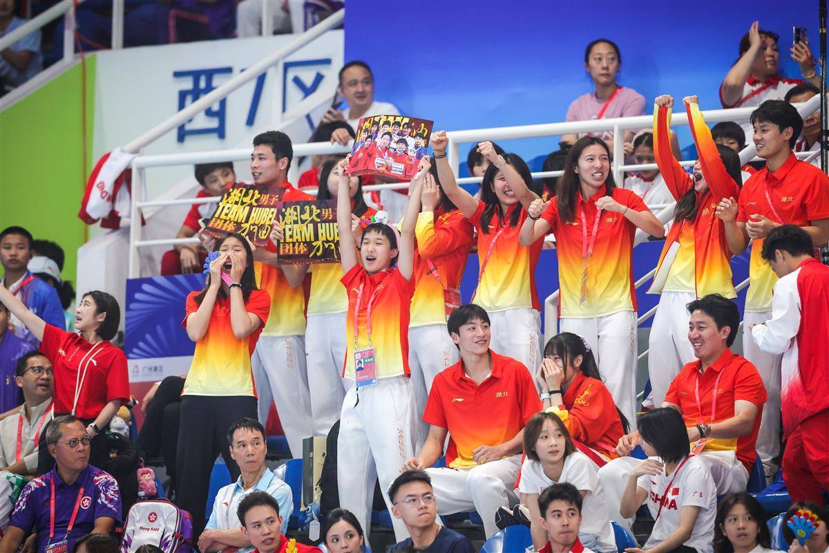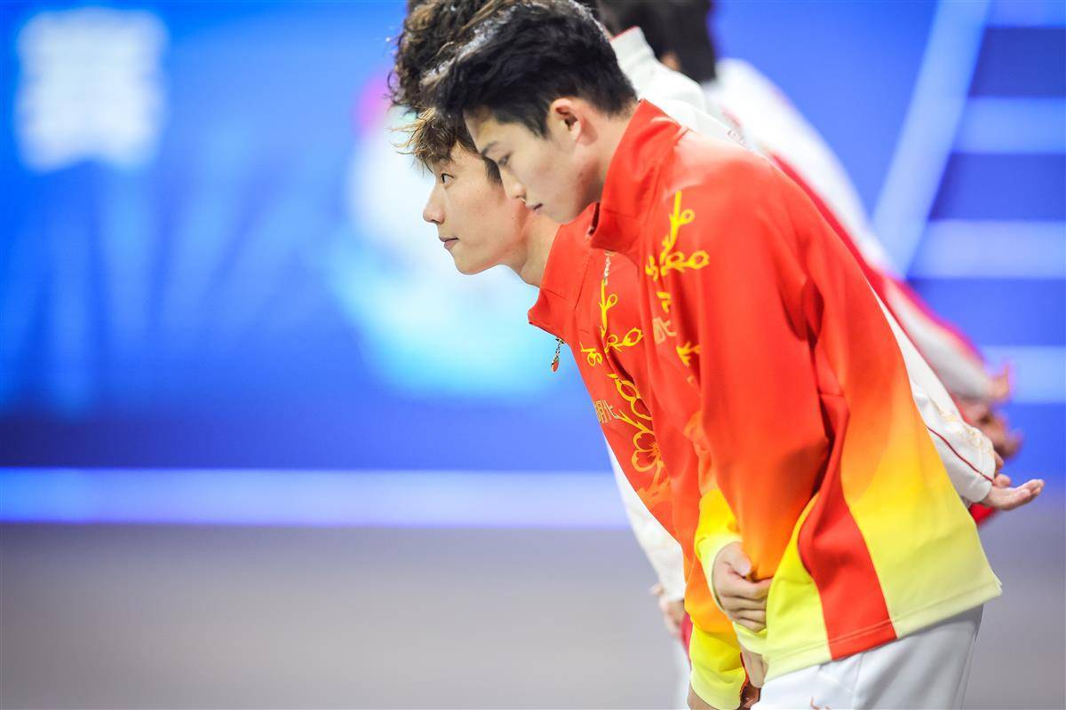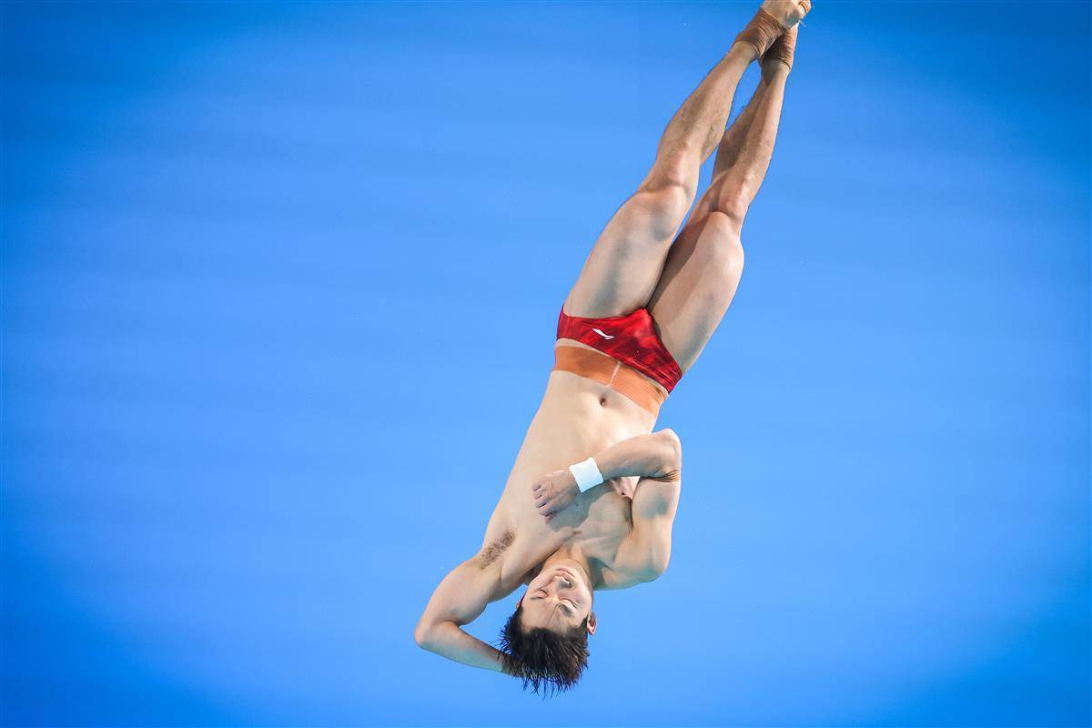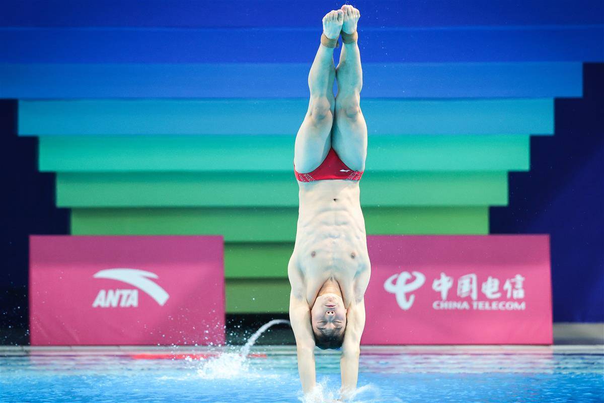11月3日,广东奥体中心游泳馆,第十五届全运会跳水项目展开男子团体决赛的争夺。在个人三米板比赛中,奥运冠军、湖北老将王宗源以544.3分锁定第一,其中最后一跳更是跳出100.70分;另一名湖北名将、世界冠军郑九源以489.25分位列第三。(湖北日报全媒记者 时龚 摄)