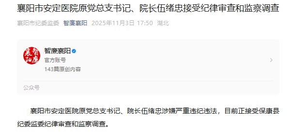 据襄阳市纪委监委消息,襄阳市安定医院原党总支书记、院长伍绪忠涉嫌严重违纪违法,目前正接受保康县纪委监委纪律审查和监察调查。