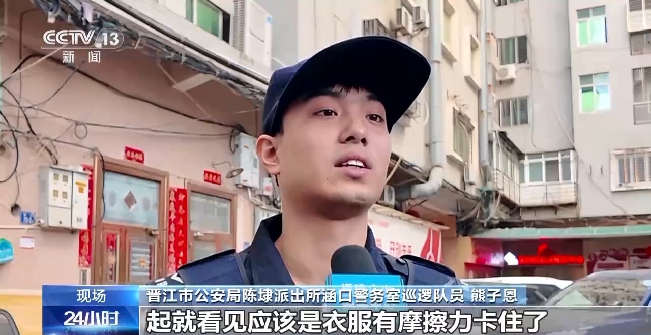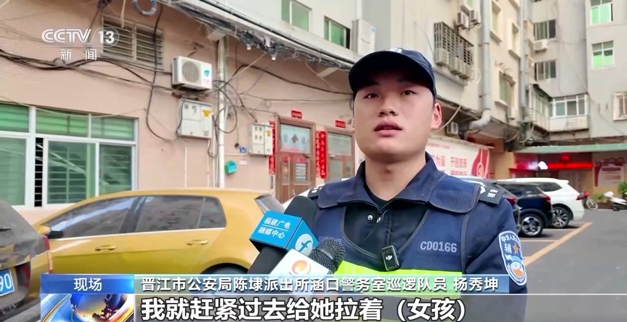 晋江市公安局陈埭派出所涵口警务室巡逻队员 杨秀坤:她家里门没关,我看见一位女士在窗户那里拉着那个小女孩,她说没力气了,我就赶紧过去拉着那个小女孩。