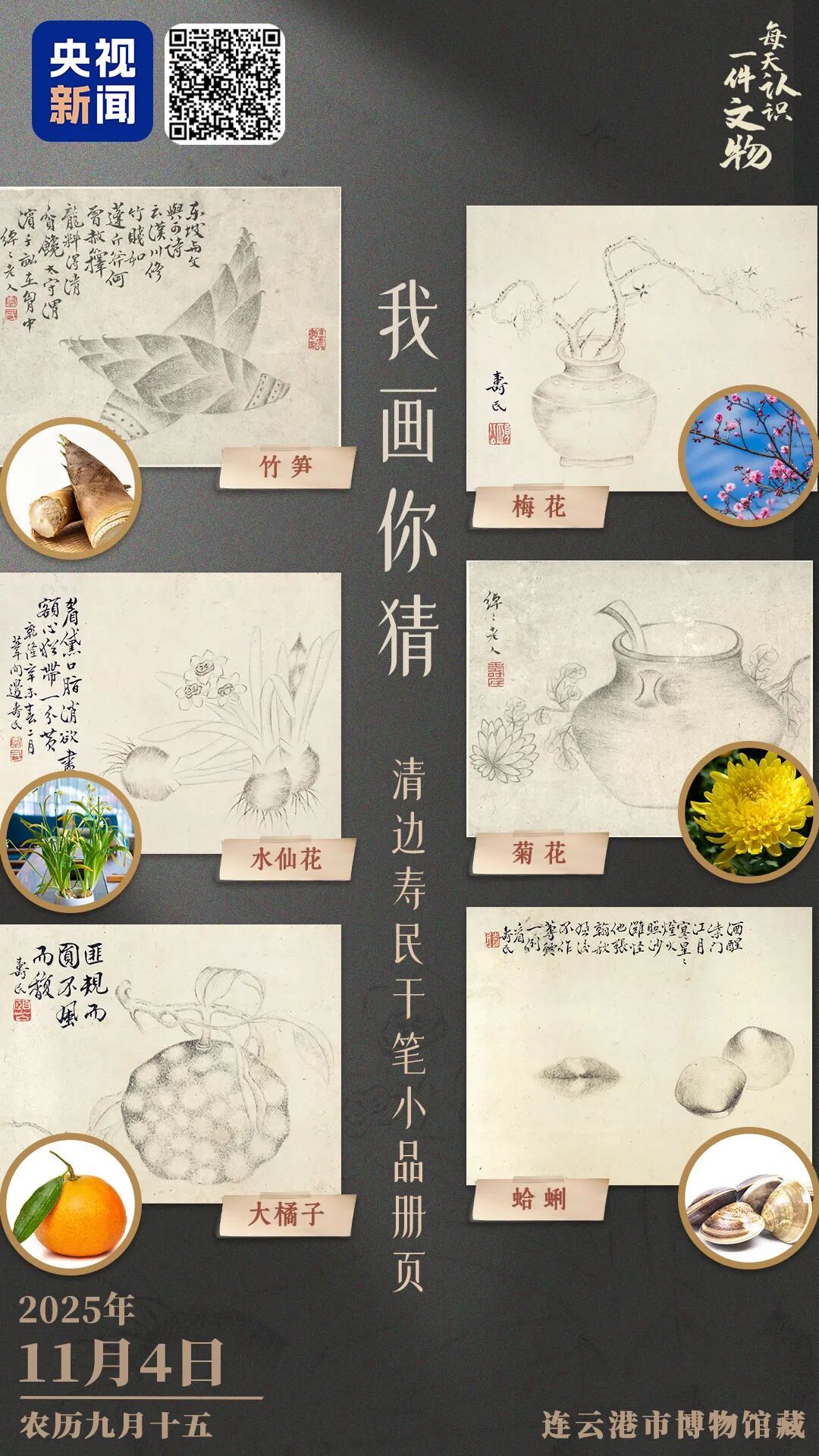 这件干笔小品册页,是清乾隆时期画家边寿民的作品,册页共包含六幅画,有竹笋、梅花、菊花、大橘子、蛤蜊、水仙花,每幅画都简洁明快,线条简单却笔法细密,有着清新自然的韵味,堪称清代“可爱速写”。