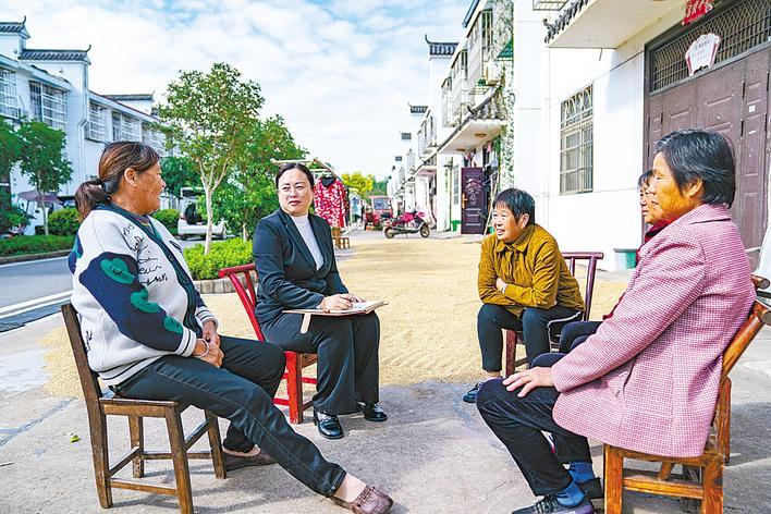 村党委委员黄玲拿着笔记本,脚步轻快地应声走来。余桂珍从堂屋里拿出椅子,摆在大门口,两人坐着拉起家常。