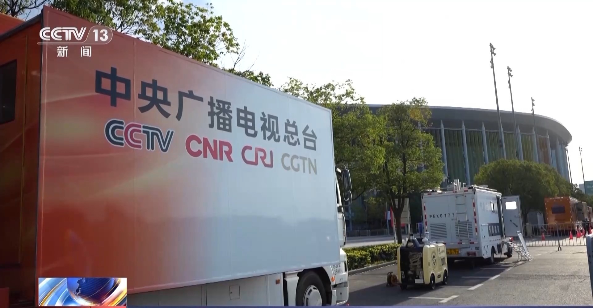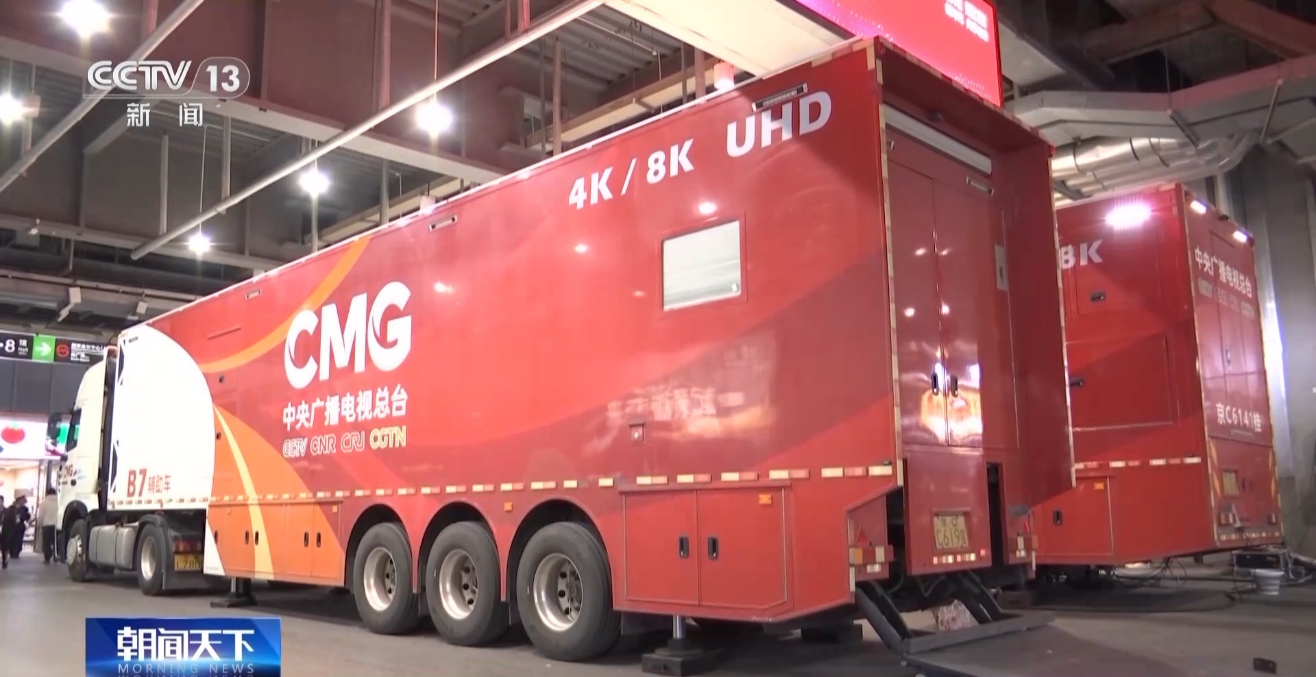 在进博会现场,总台“中国红”4K/8K IP超高清转播车再次亮相。