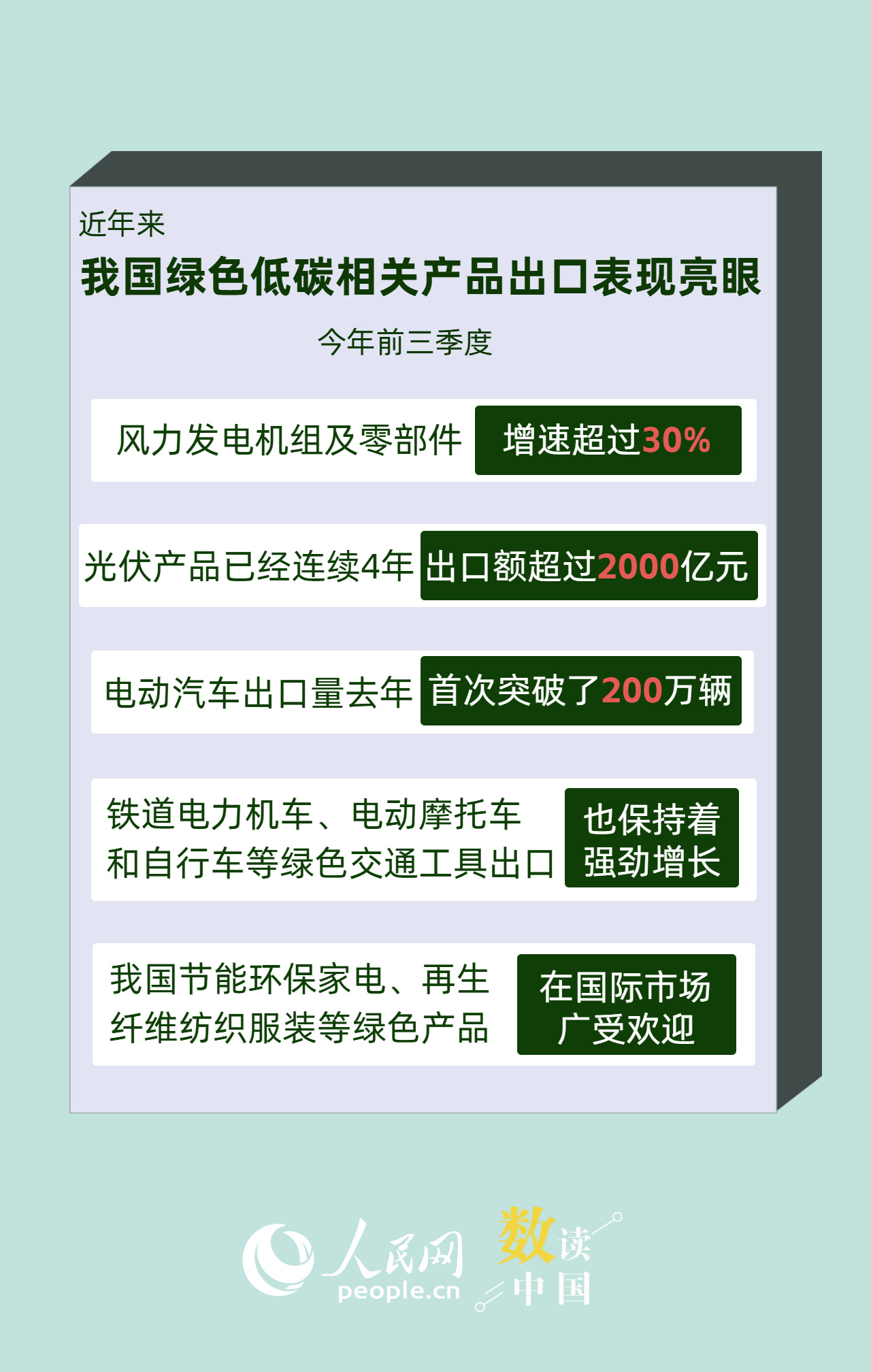 今年前三季度,风力发电机组及零部件增速超过30%;光伏产品已经连续4年出口额超过2000亿元;电动汽车出口量去年首次突破了200万辆……近年来,中国外贸企业积极顺应贸易绿色化趋势,将绿色低碳理念转化为优质产品,丰富了全球供给。一组数据,带你看中国外贸“向绿色”发展步伐加快。